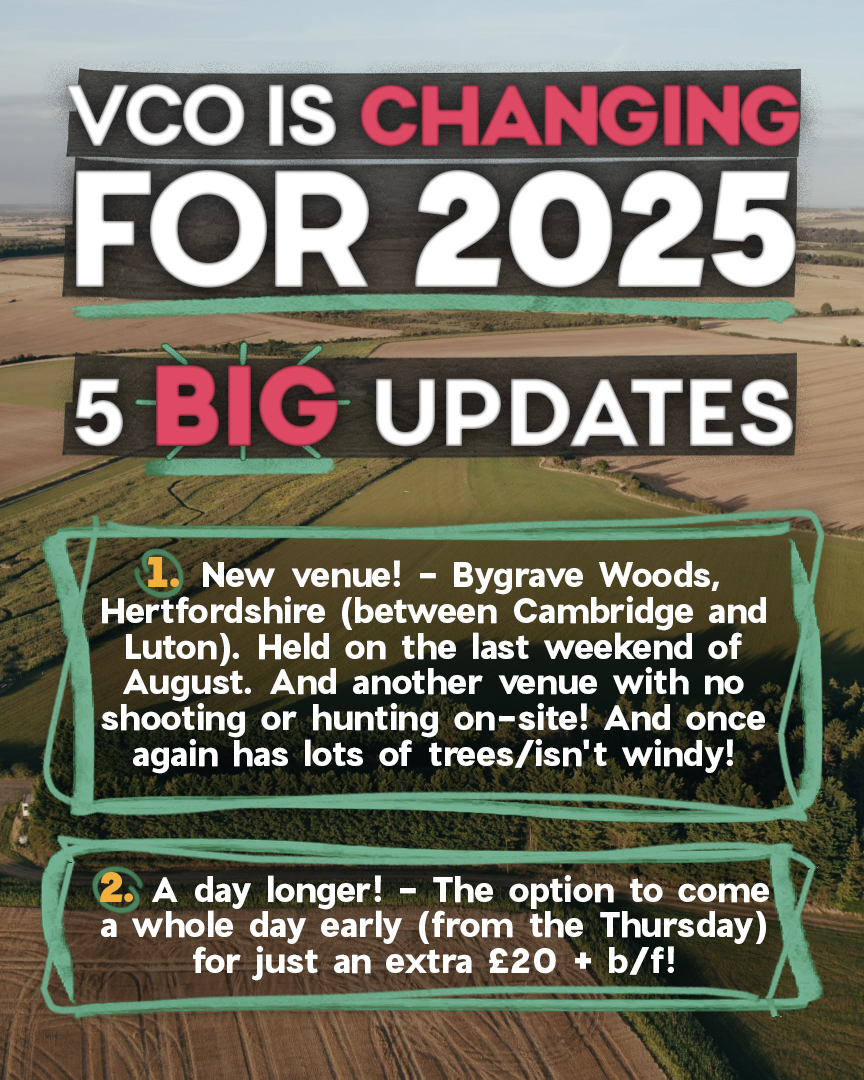Tickets from ticketpulse.co.uk/vco25. Glamping is also now available from ontick.co.uk/event/vco2025 and pre-pitched camping at bit.ly/3ykTVbI (both will get the extra night included if you buy the Thursday entry)